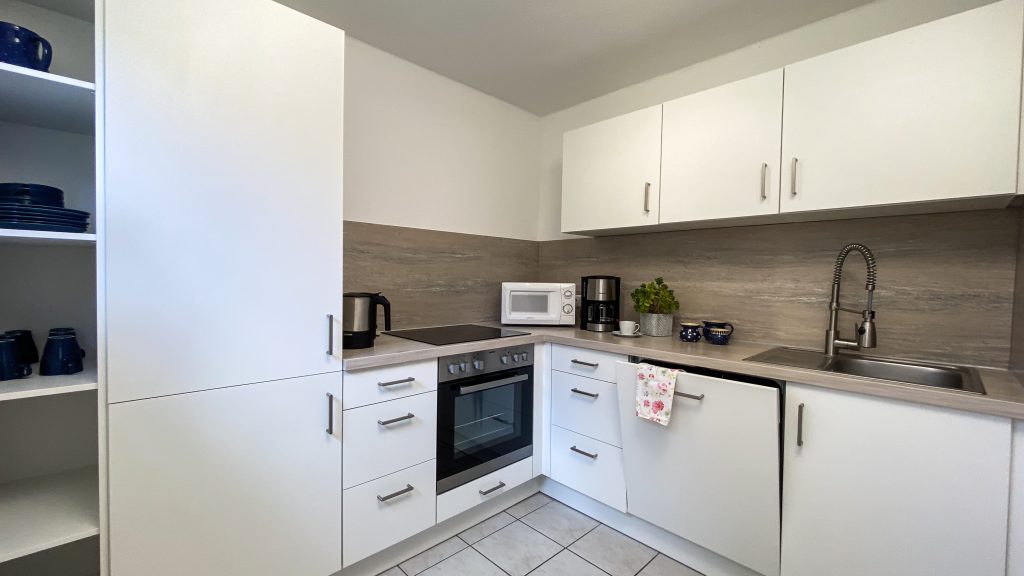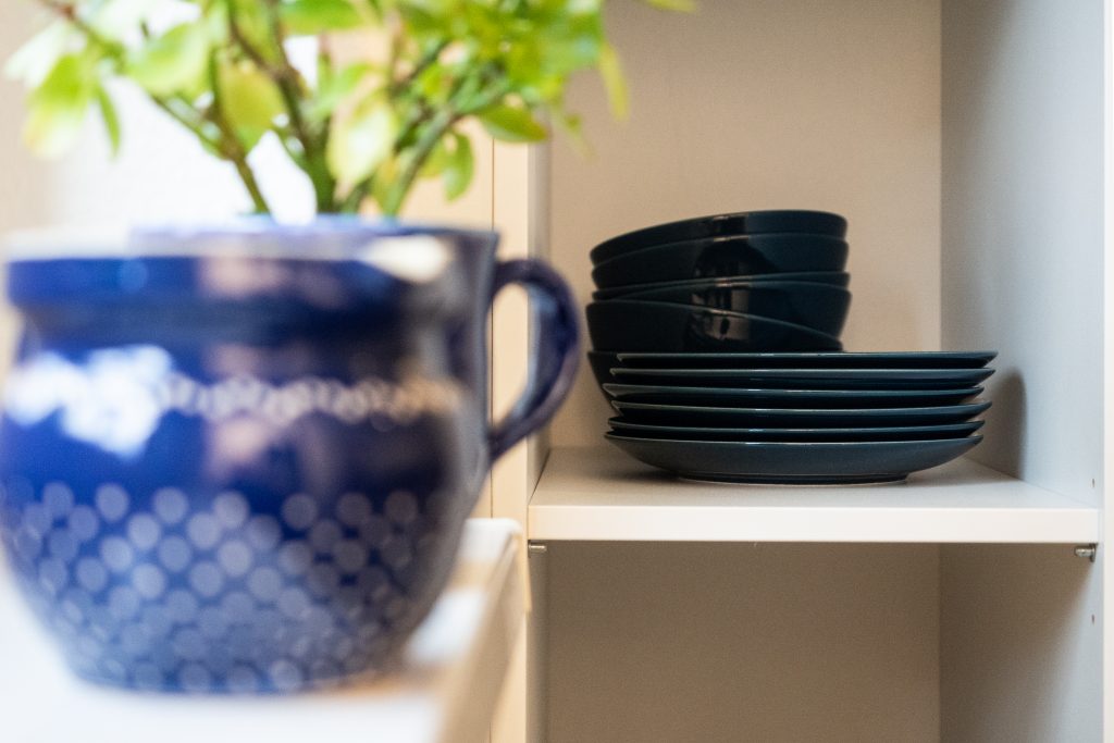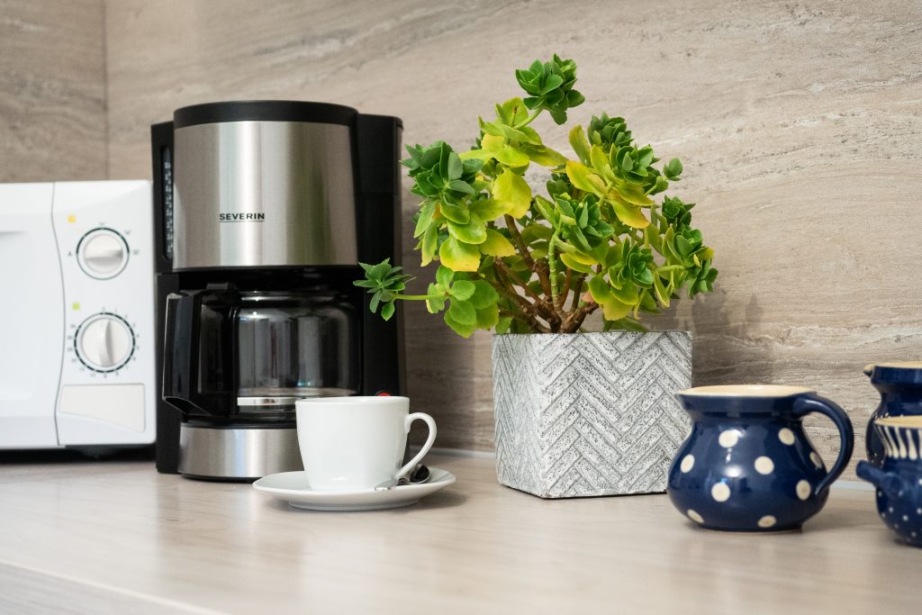Mikrowelle, Kaffeemaschine, Topfpflanze und Kaffeegeschirr